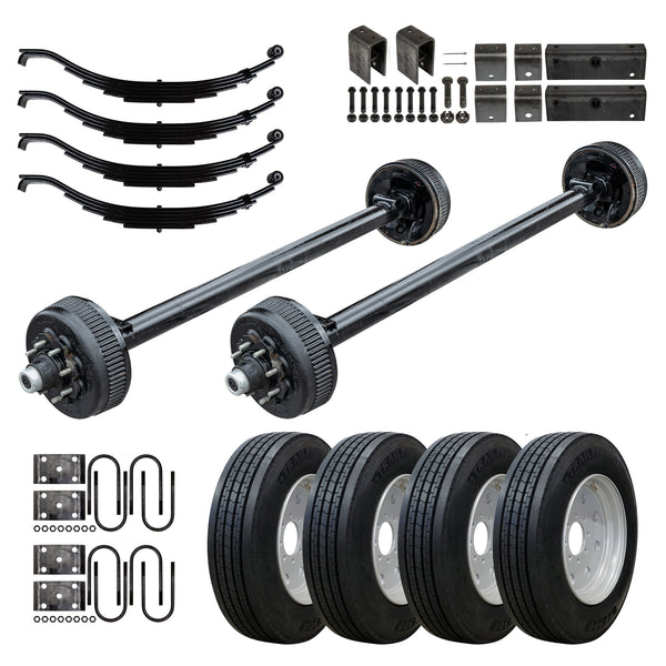 This 8K tandem axle trailer kit makes it easy to assemble your new trailer and get it on the road in no time at all. Each kit comes with two 8K axles, four 4K slipper springs, two 4K U-bolt kits, one tandem hanger kit, and four 17.5" 18-ply radial tire and wheel assemblies. We've bundled everything into one package so that instead of having to buy things individually, you can order one kit and get to work. If you're looking for new axles for your business, then order this kit today!